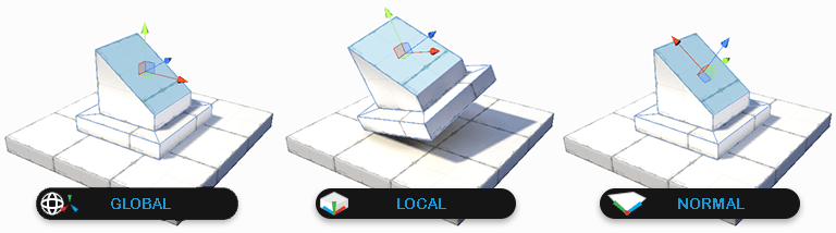 The Orientation action sets the orientation of scene handles when you select objects and elements. Click the Orientation button to switch between the three states: Global, Local, or Normal.