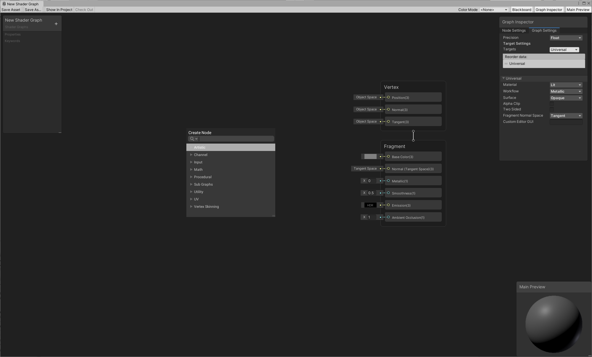 Certain integrations, like Render Pipelines, can also provide pre-configured options for Shader Graphs. For this example, a Universal > Lit Shader Graph has been created and opened.