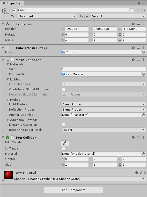 Now that you have assigned your shader to a Material, you can apply it to objects in the Scene. Drag and drop the Material onto an object in the Scene. Alternatively, in the object's Inspector window, locate Mesh Renderer > Materials, and apply the Material to the Element.
