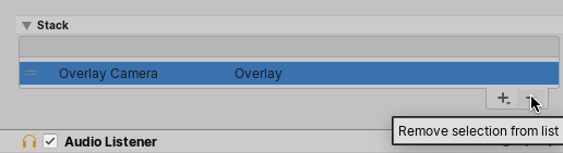 - In the Camera Inspector, scroll to the Stack section, click the name of the Overlay Camera you want to remove, and then click the minus (-) button.